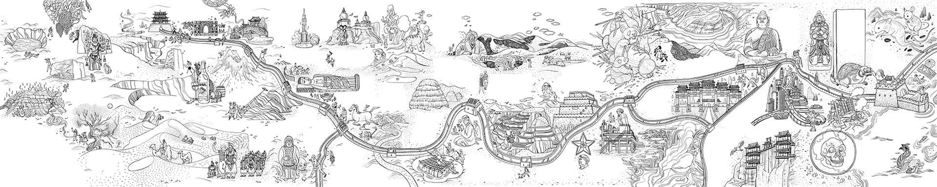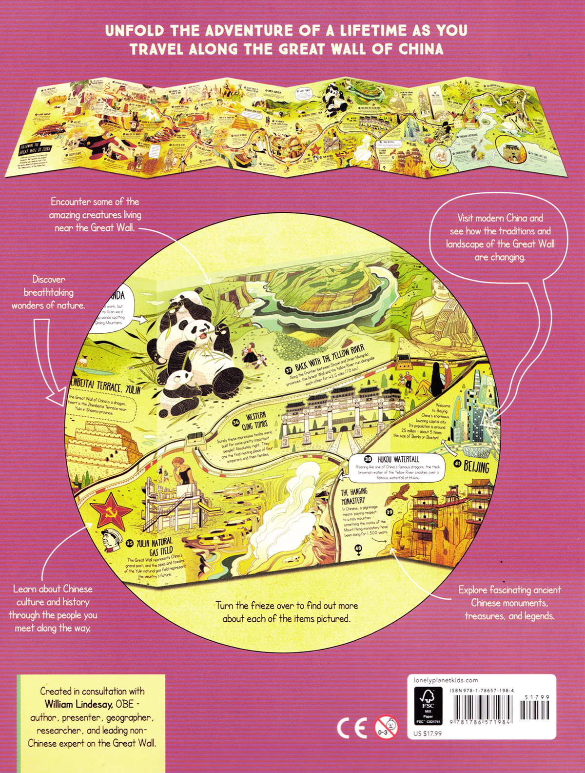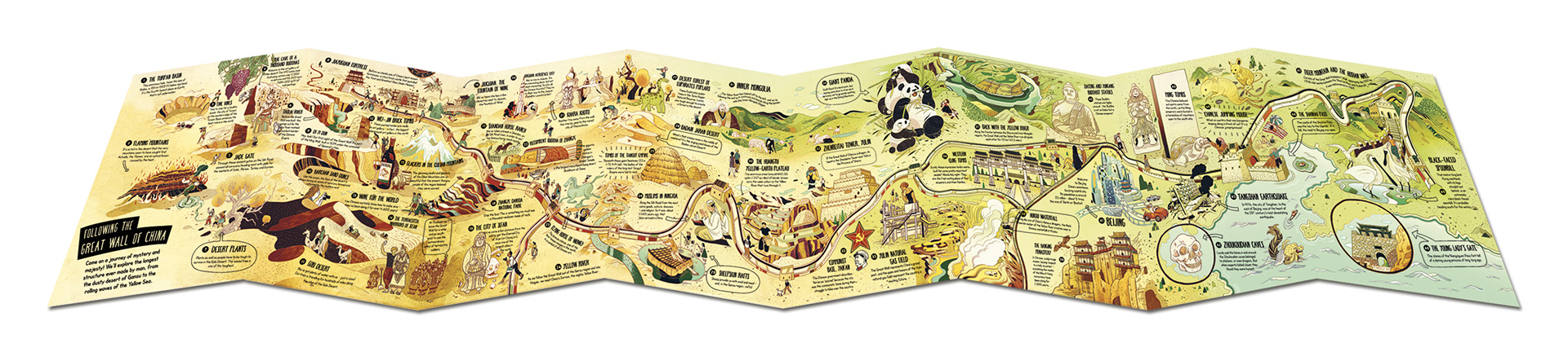 From the dusty desert of Gansu province to the rolling waves of the yellow sea, The Great Wall of China stretches across much of North China, it is the longest man-made structure in the world, if all pieces of the wall were added together, experts believe it would measure around 13, 171 miles ( 21,196 km). The wall isn't just a wall- it has watchtowers, castles, and other fortifications with mesmerizing landscape and wild-life dotted in between. Unfold this pull-out wall frieze and travel along the Great Wall of China.