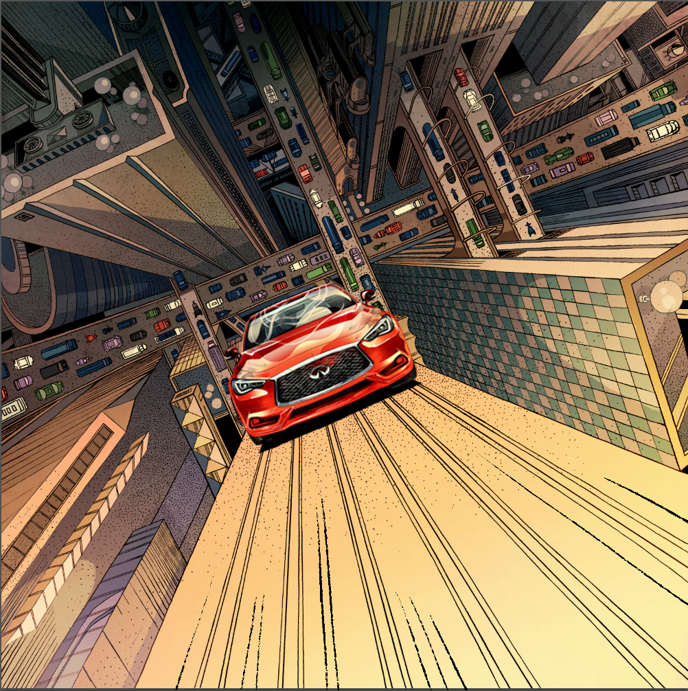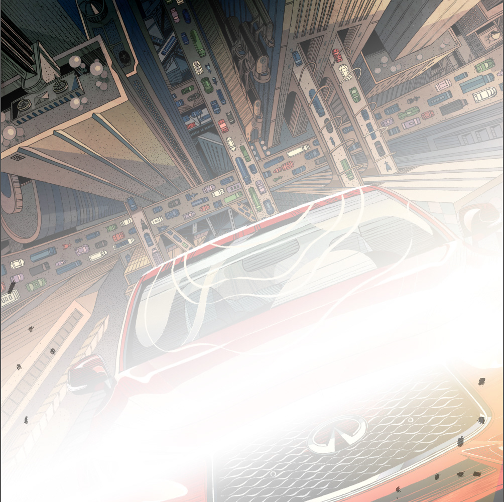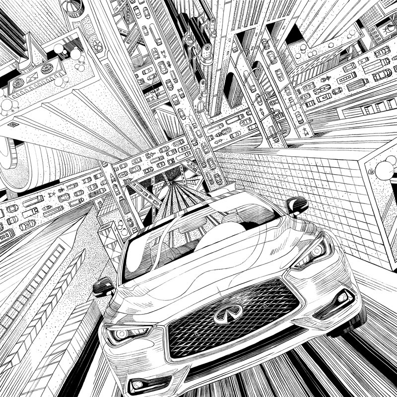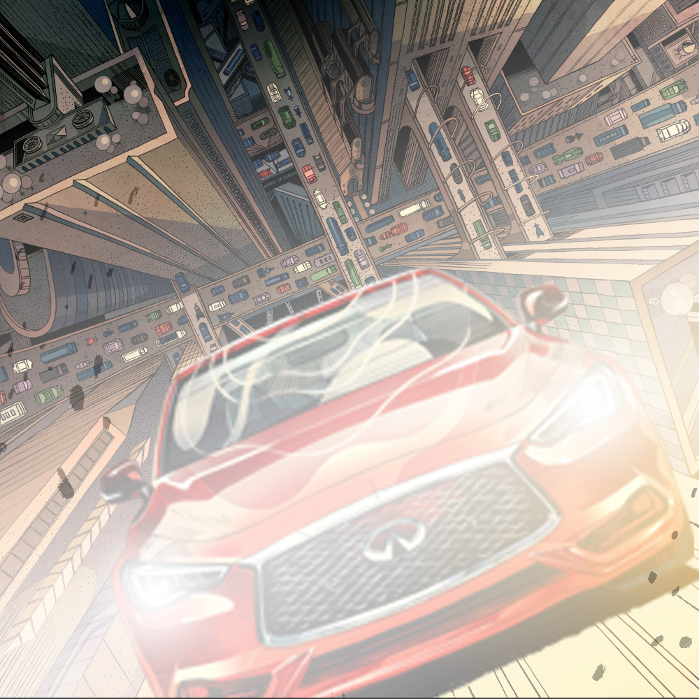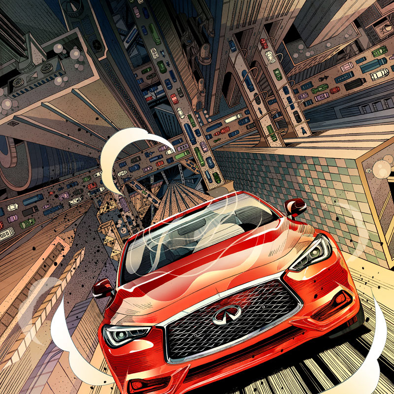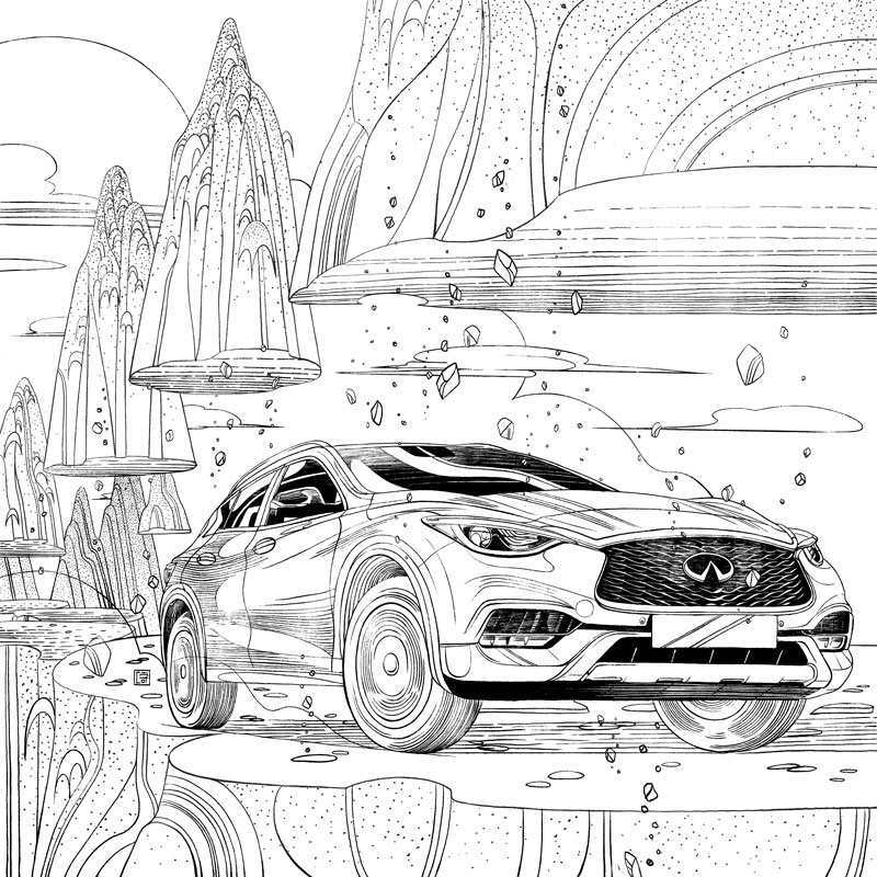 I am so excited to share with you this recent collaboration with INFINITI. There are a few qualities that captivated me and eventually inspired the art pieces: elegant, powerful, daring, and forward while redefining boundaries and possibilities. The main stories of the INFINITI QX30 and Q60 are both about blazing new trails where there were none, as a way of saying that INFINITI and its drivers are trendsetters instead of followers. The Q60, which feels more metropolitan to me, is placed in a busy city where roads are always packed, but our creative and stylish vehicle manages to defy gravity and create its own path. The infinitely receding surface of the skyscraper is meant to echo the "open road" concept which inspired the logo of INFINITI. The QX30 being a crossover, I have placed it in a rugged outdoor scene, where mountains move apart to let it pass and show off its power and durability. #SponsoredbyINFINITI 2019 Society of Illustrators NY 61