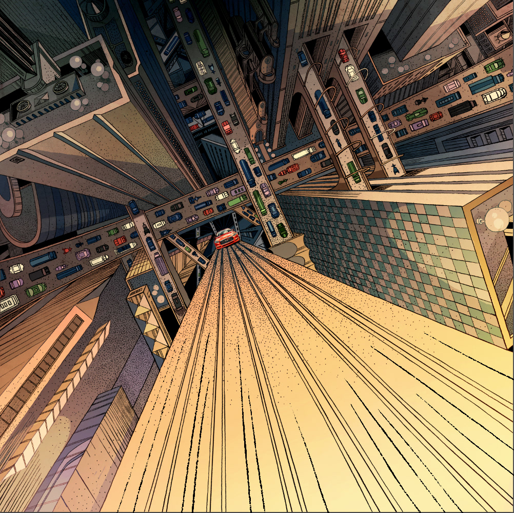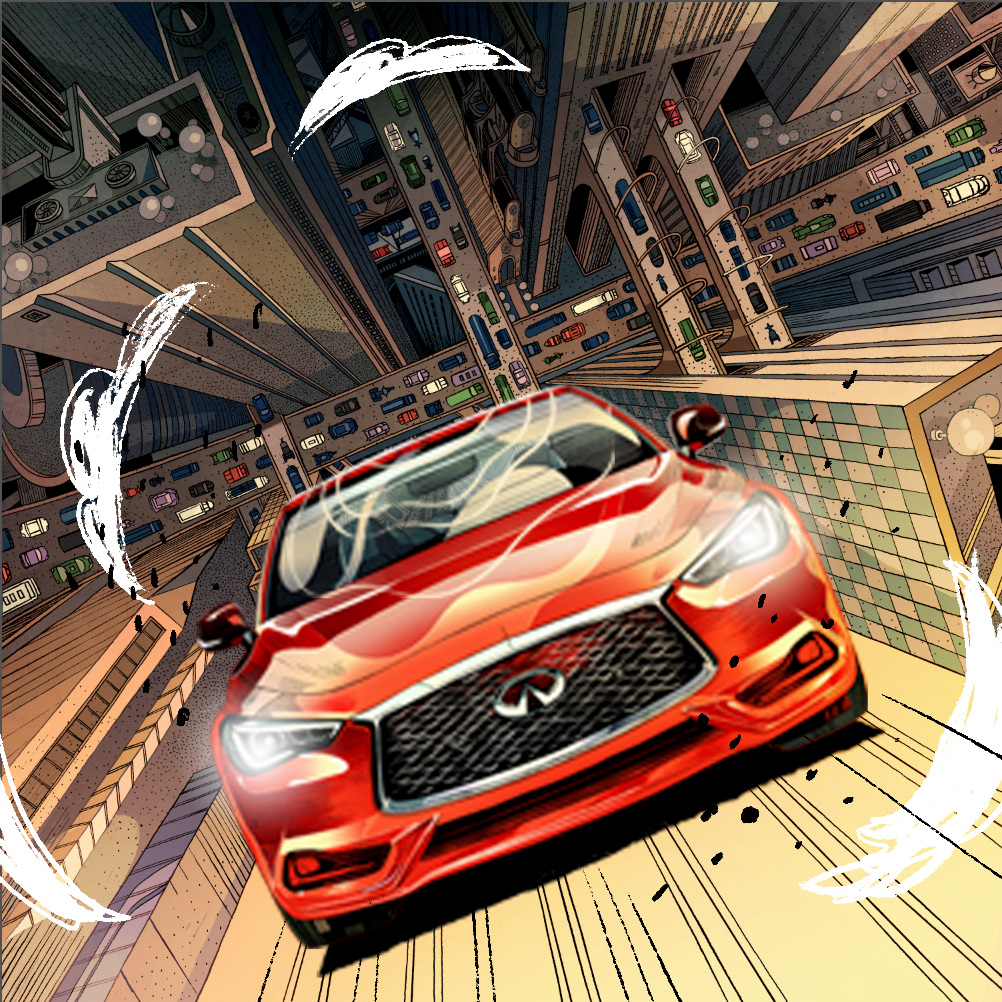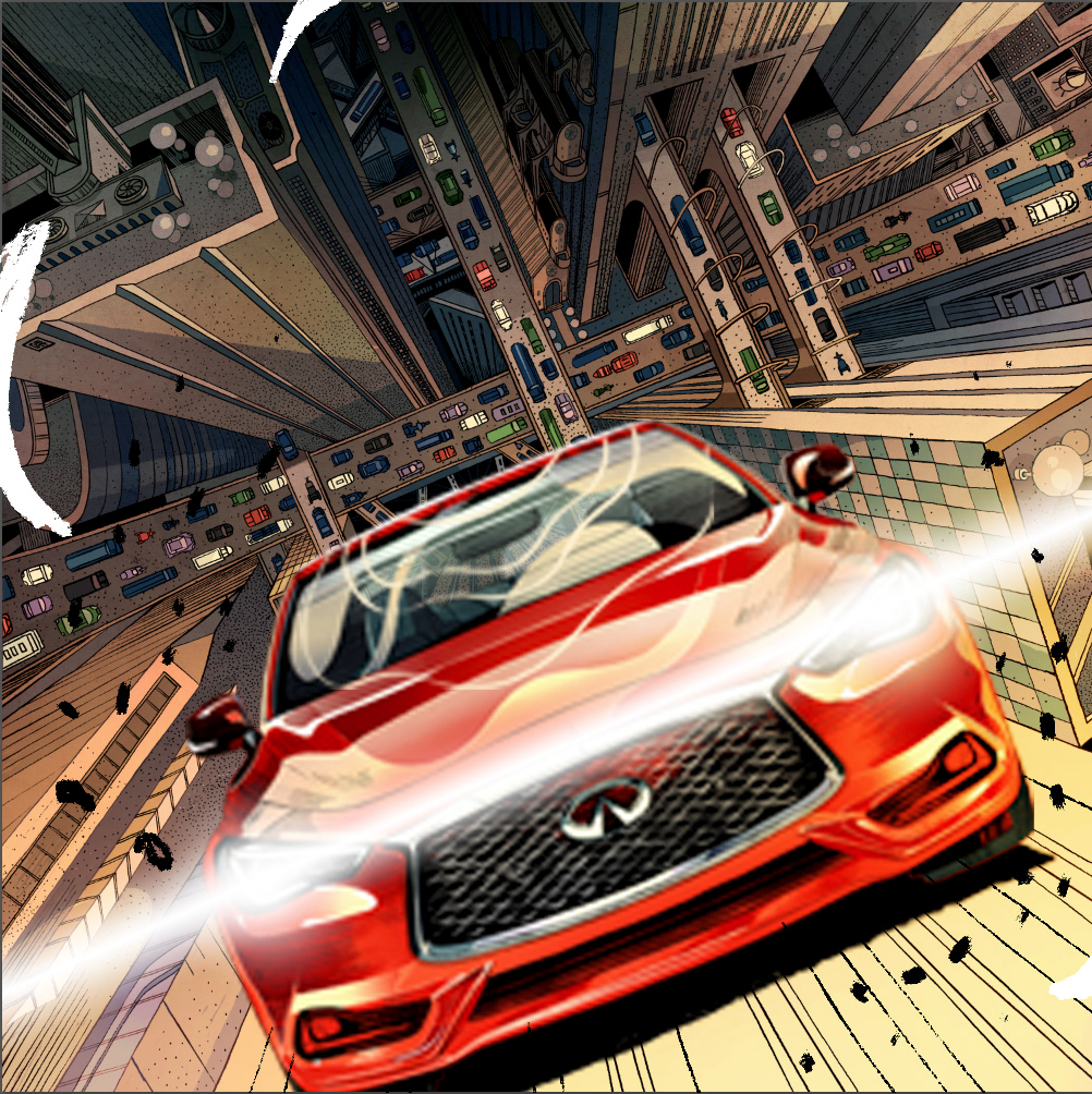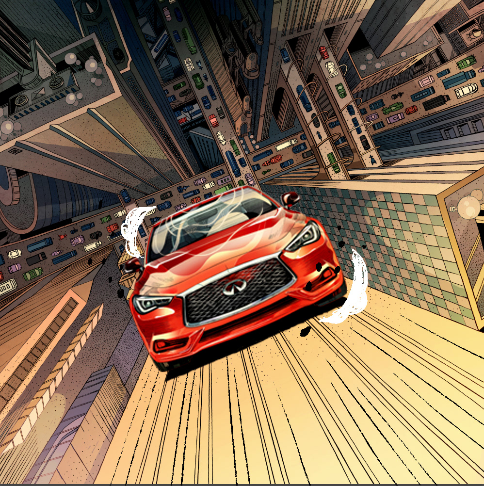 I am so excited to share with you this recent collaboration with INFINITI. There are a few qualities that captivated me and eventually inspired the art pieces: elegant, powerful, daring, and forward while redefining boundaries and possibilities. The main stories of the INFINITI QX30 and Q60 are both about blazing new trails where there were none, as a way of saying that INFINITI and its drivers are trendsetters instead of followers. The Q60, which feels more metropolitan to me, is placed in a busy city where roads are always packed, but our creative and stylish vehicle manages to defy gravity and create its own path. The infinitely receding surface of the skyscraper is meant to echo the "open road" concept which inspired the logo of INFINITI. The QX30 being a crossover, I have placed it in a rugged outdoor scene, where mountains move apart to let it pass and show off its power and durability. #SponsoredbyINFINITI 2019 Society of Illustrators NY 61